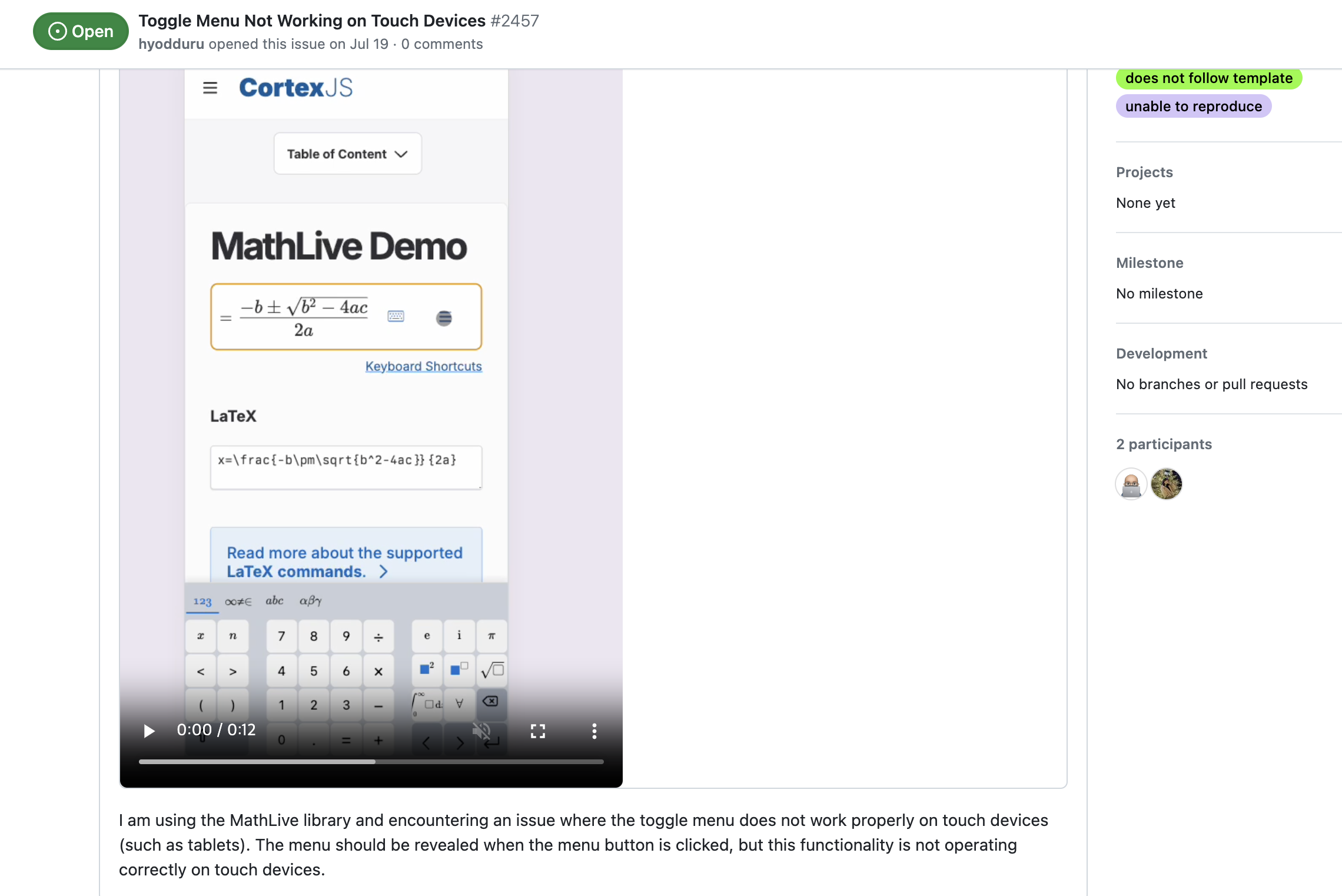 처음에는 해당 문제를 해결하기 위해서 mathlive github에서 동일한 이슈를 겪고 있는 사람들이 있는지 확인해보았지만 딱히 관련한 정보를 찾을 수는 없어서 직접 issue를 올렸으나 답이 오지않았다...